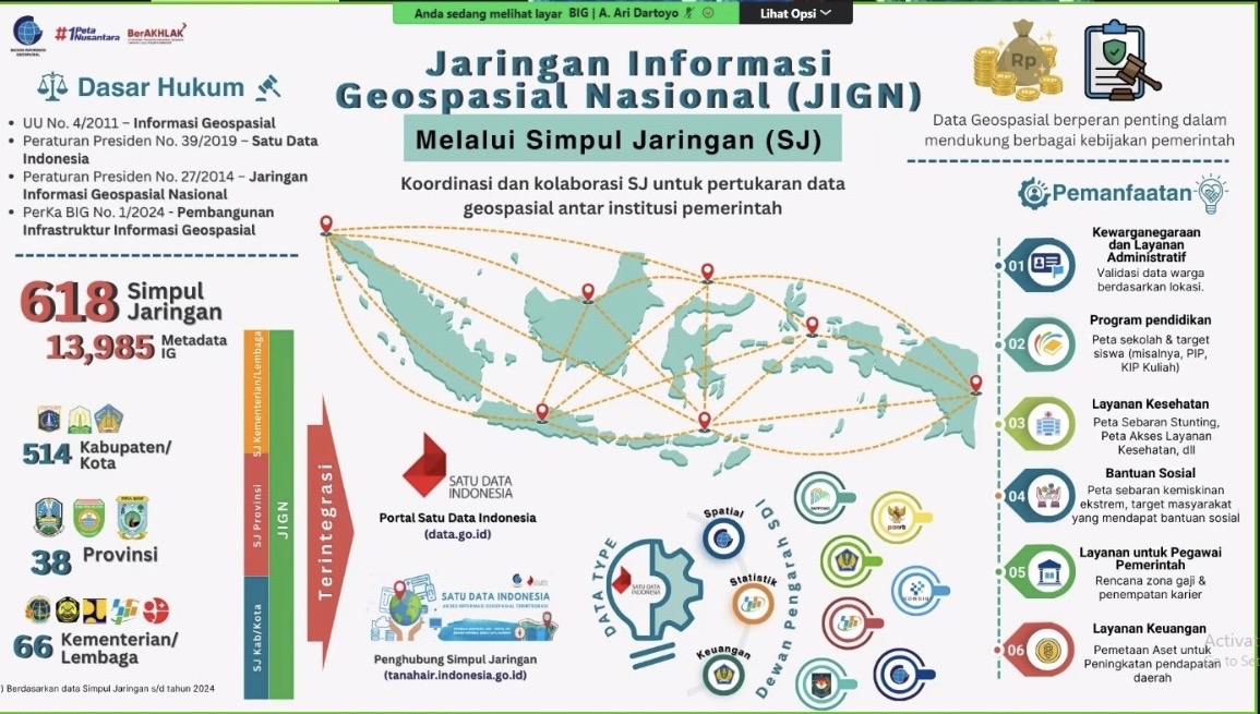 “Melalui simpul jaringan informasi geospasial, kita bisa mewujudkan interoperabilitas dan konsistensi data. Hal ini akan mendukung pembangunan yang efektif, efisien, dan akuntabel,” tambahnya.