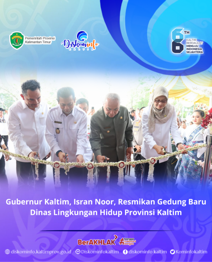 Gubernur Kaltim, Isran Noor, dengan kehadiran Wakil Gubernur Kalimantan Timur, Hadi Mulyadi, Sekretaris Daerah Provinsi Kaltim, Sri Wahyuni, Kepala DLH Kaltim, E.A. Rafiddin Rizal, Sekretaris Diskominfo Kaltim, Edi Hermawanto Noor, serta kepala OPD lingkup Pemprov Kaltim dan perwakilan dari Perangkat Daerah, Instansi Vertikal, meresmikan penggunaan gedung kantor Dinas Lingkungan Hidup (DLH) tersebut.
