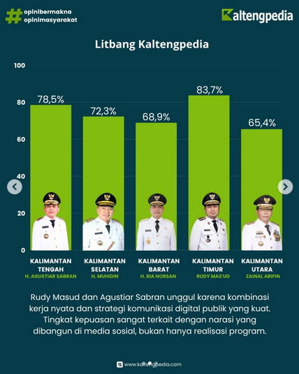 Selain Rudy, Gubernur Kalteng Agustiar Sabran juga menuai respons positif dengan tingkat kepuasan 78,5 persen, berkat program Food Estate 2.0 dan Desa Digital yang gencar diberitakan. Sementara Rudy Mas’ud menonjol dalam tema IKN, transformasi digital, dan kepemimpinan progresif yang viral di jagat media sosial.